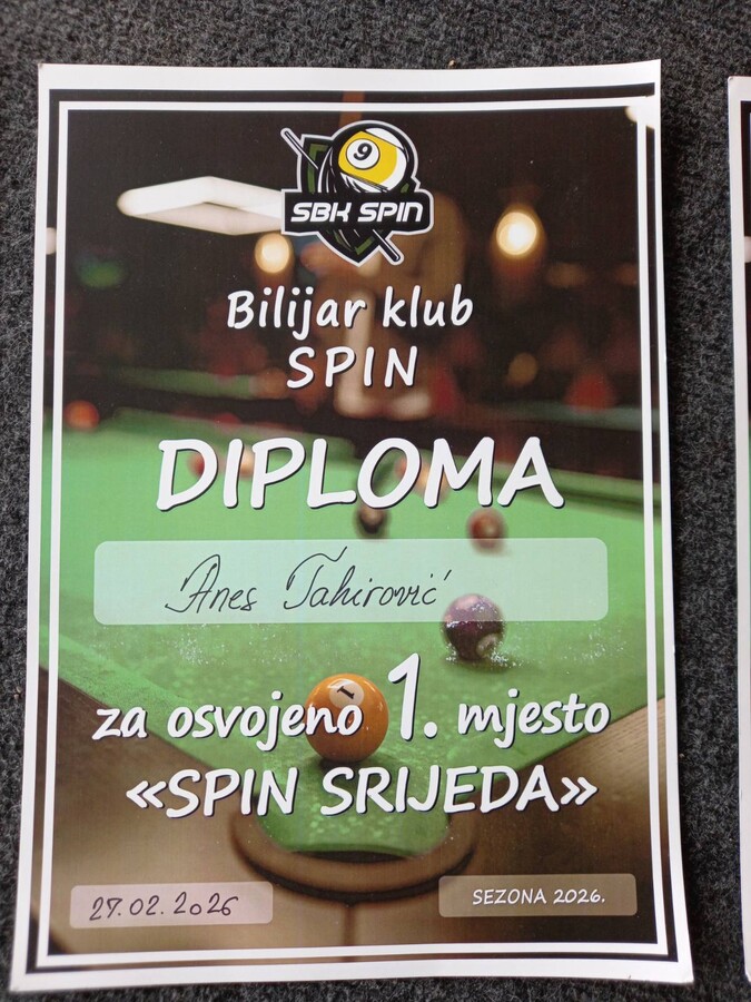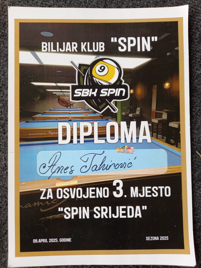 Naš učenik Anes Tahirović, učenik 7.a razreda, uspješno trenira u Bilijar klubu Spin Živinice!