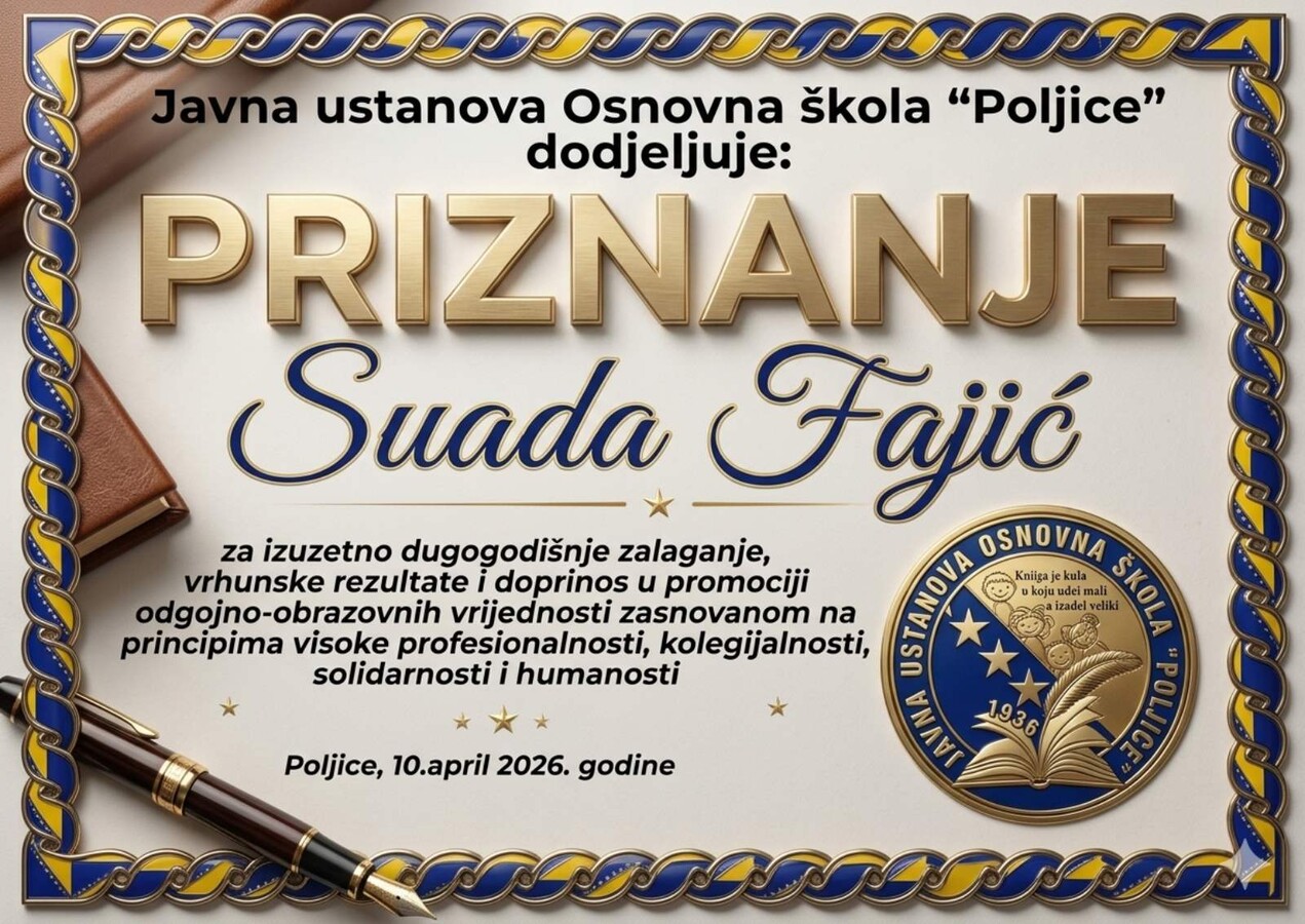 Kolektiv Osnovne škole „Poljice“ zahvaljuje se Suadi Fajić na njenom dugogodišnjem radu, trudu i doprinosu, uz iskrene želje da penzionerske dane provede u zdravlju, miru i ličnom zadovoljstvu.